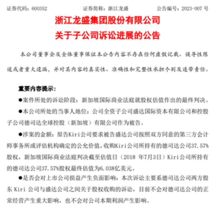 2018年7月,新加坡国际商业法庭判决盛达公司收购Kiri公司所持有的德司达37.57%股权。2021年6月,浙江龙盛收到收到新加坡国际商业法庭的文件,法院判决截至估值日(2018年7月3日),Kiri公司所持有的德司达37.57%股权的估值为4.816亿美元。